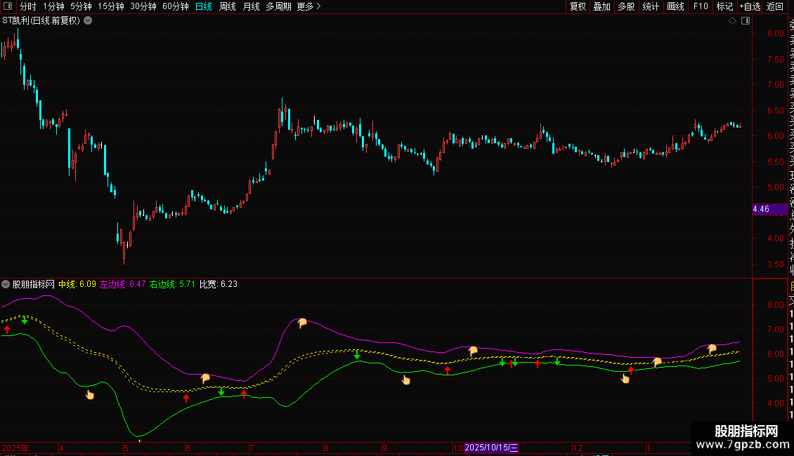 1. 指标性质:这是一个带有时间限制的通道类指标,包含中线、上轨(左边线)、下轨(右边线)以及买卖点信号。