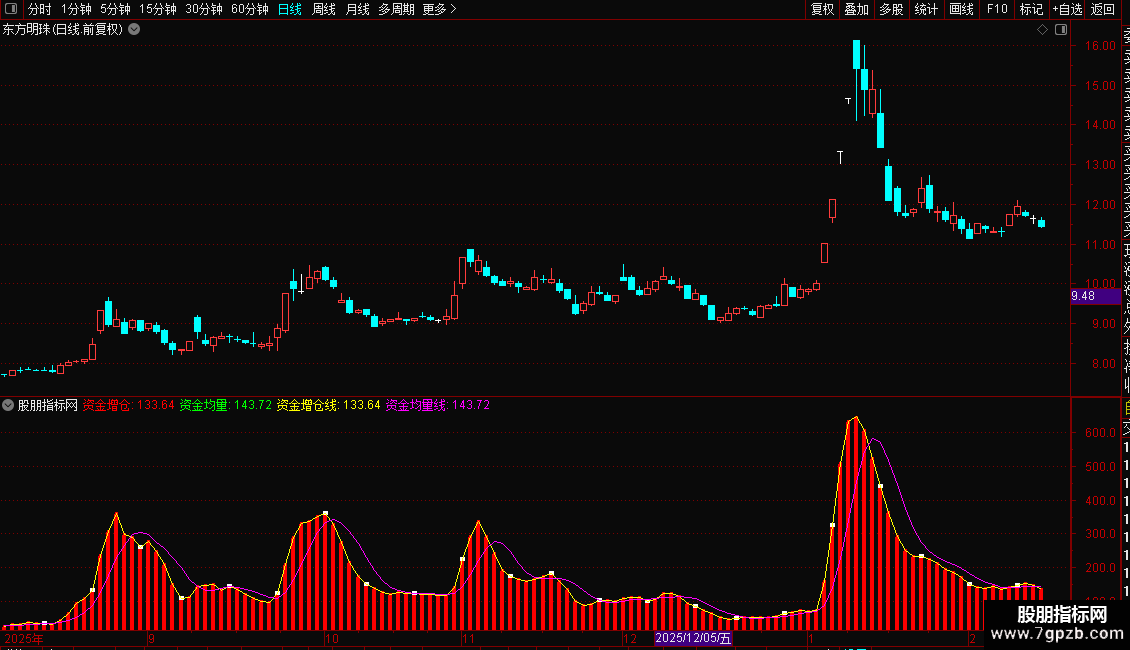 资金均量(绿色线):绘制变量D的5日简单移动平均线,以绿色线条显示。代表短期资金增仓趋势的平均水平。