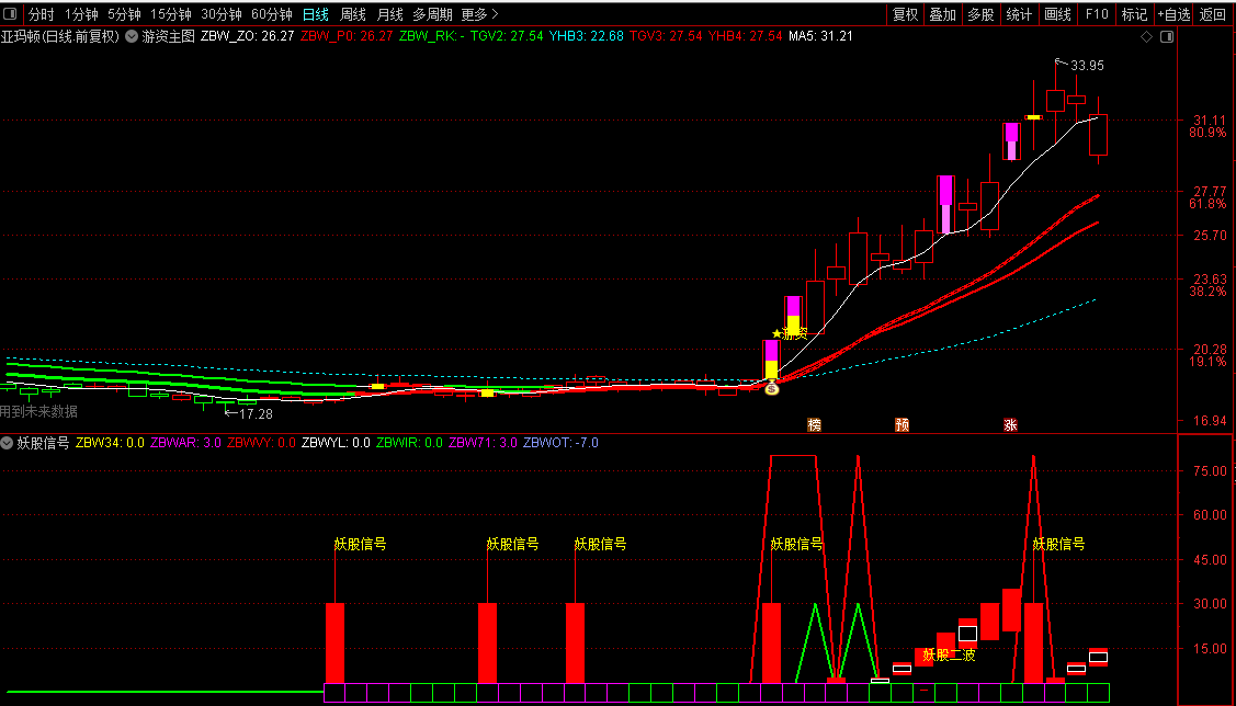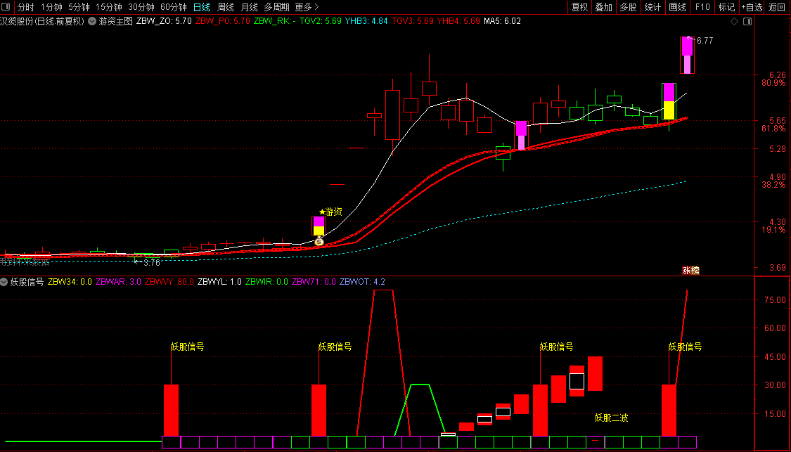 信号识别:红色柱状+ "妖股信号"文字=主力启动点,黄色"妖股二波"=二次拉升机会