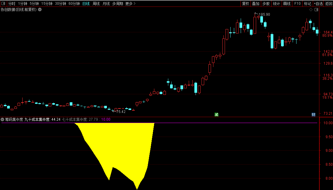 上面的指标中,我统计了70%的筹码集中度和90%的筹码集中度,两个数值都是小于10进行标记,70%小于10画黄色带,90%小于10画紫色带。