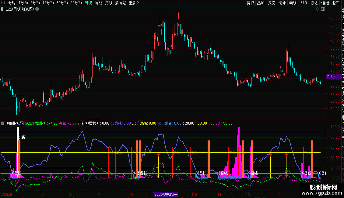 用法:这是一个强烈的“抄底”触发信号。当“底部吸筹指标”从下方上穿-24时,会触发一根贯穿画面的白色长柱,提示可能的中线买点。