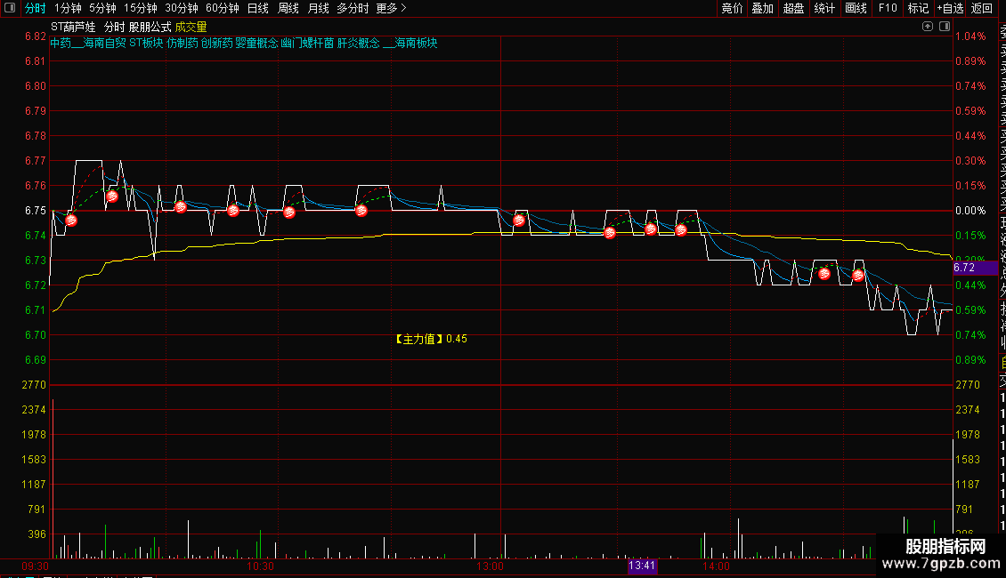 分时一致追涨主图是一款适配通达信的分时操盘工具,核心围绕量价、均线、主力资金等维度,精准捕捉分时阶段的追涨机会。公式自动适配ST股、不同市场板块(如创业板、科创板)的涨跌幅规则,实时计算涨停/跌停价、主力资金偏离值(主力值),通过EMA7(7分钟均线)、EMA26(26分钟均线)构建支撑与突破体系,同时结合MACD、量比、主力/大户/散户资金线等指标,识别“主力来了”“捉牛”等关键信号。