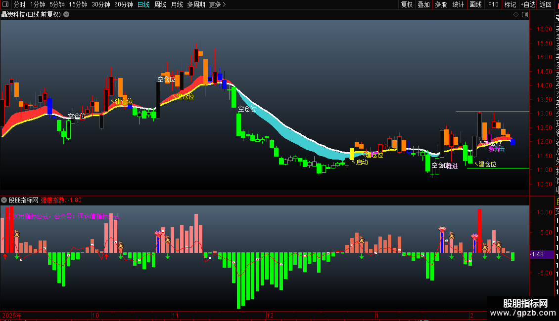 2. 副图:红色/黄色柱体代表股价偏离度高(强势),绿色柱体为弱势;蓝色柱体/25号图标提示量能异动拉升,2号/15号图标提示强度回落,可结合主图信号确认买卖时机。