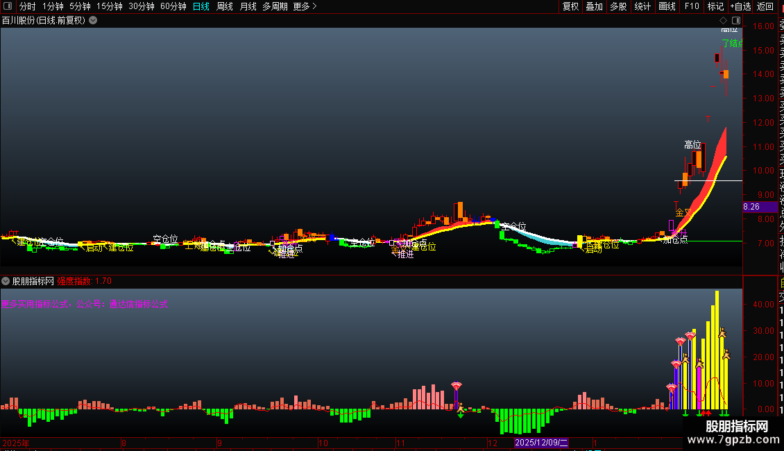 2. 副图核心:量能突破+强度指数,通过柱体/图标反映资金活跃度,辅助验证趋势;
