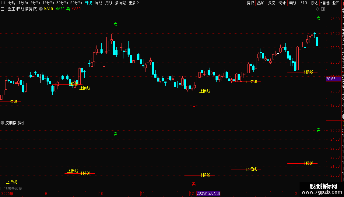 - 当AF成立时,在最近4日最低价位置绘制红色柱状线(高度50,线宽3倍),并标记黄色文字“止损线”。