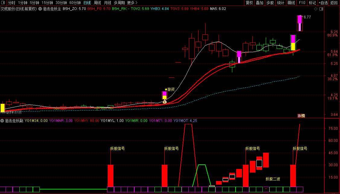 副图指标通过计算多条均线的角度平均值,生成了“妖股综合线”(MJN),用于判断个股的“妖股”潜力和风险。