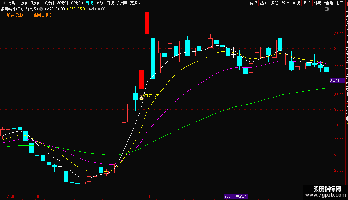 指标主要功能是监控主力资金动向与筹码集中度,识别个股所属板块,并捕捉主力吸筹结束后的爆发点。它通过计算平均成本与市场筹码分布,判断主力是否完成低位建仓。操作策略为:当出现“九天腾龙”或“九龙合力”信号,且伴随放量阳线突破时,视为强力买入时机;红色柱体代表主力积极持仓可跟进,需结合行业板块热点操作。