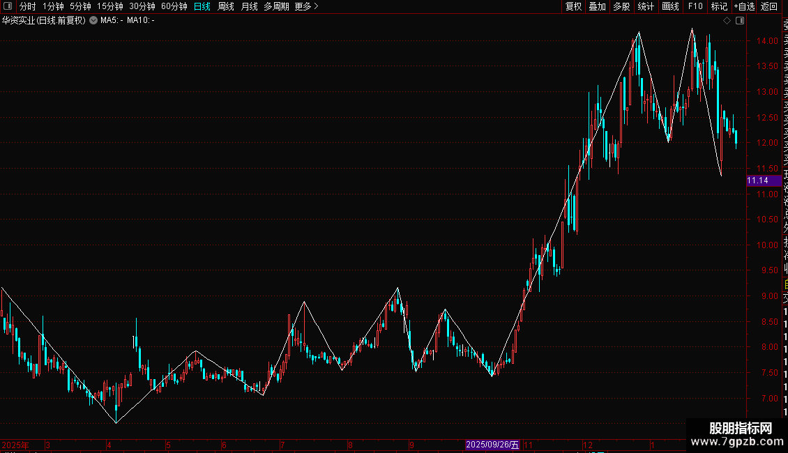- 自动连接近期高点和低点,形成两条交叉的白色线段。