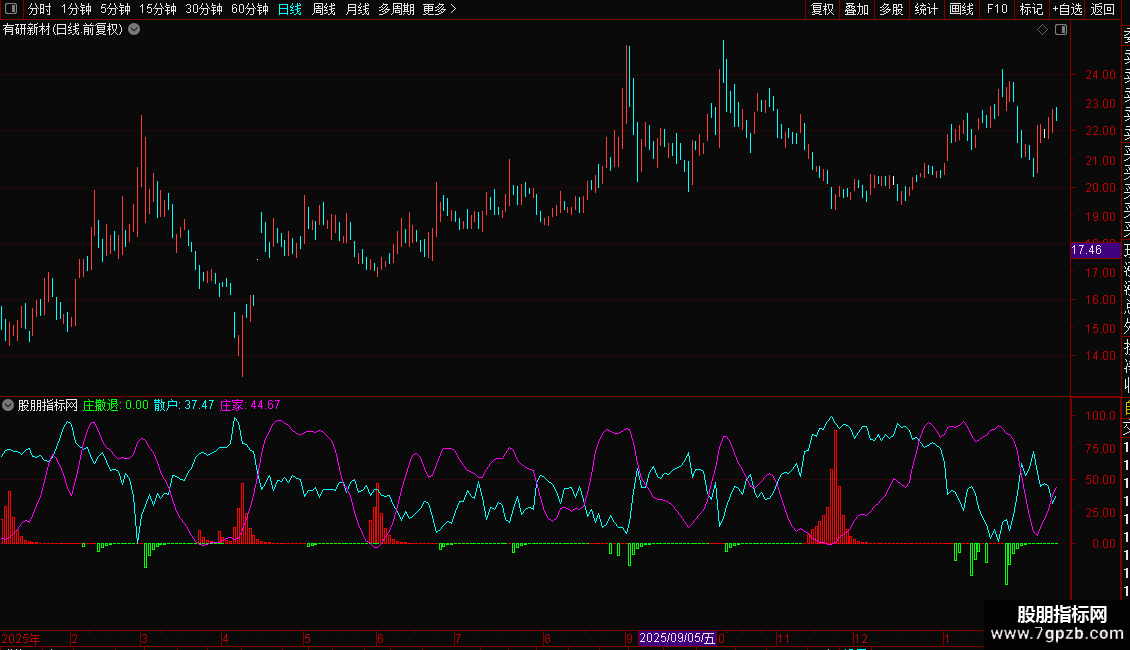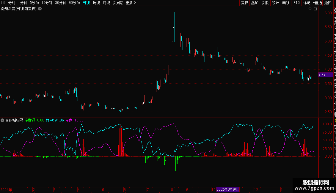 4. 庄家:紫线,代表主力资金动向,与散户线形成对比。