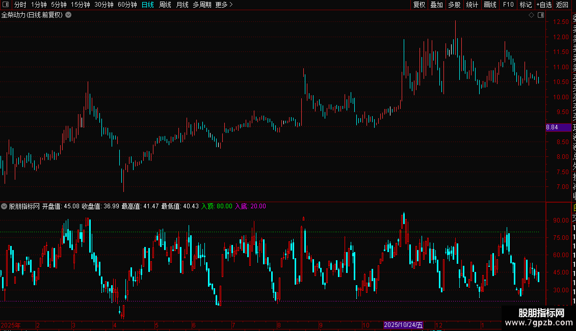 此外,指标包含一个综合信号(VAR13),该信号在满足特定条件时(如价格与成交量关系、短期相对位置超跌及价格动量极度疲软)会输出数值30。图表中还设置了80和20两条水平参考线,用于标识数值的潜在超买和超卖区域。