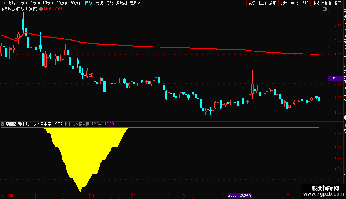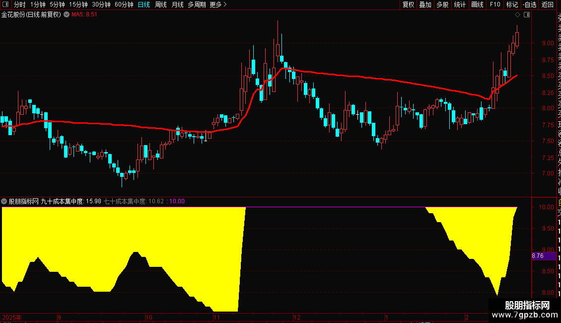 - 绘制90%和70%成本集中度数值,数值越小代表筹码越集中。