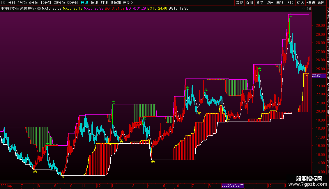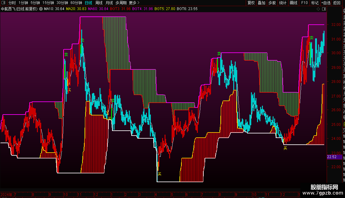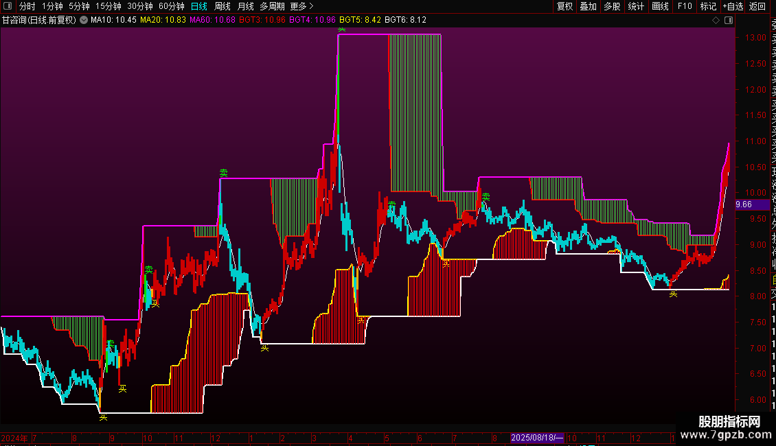 3. 支撑压力:红色BGT3(30日高点)、洋红BGT4(60日高点)为压力位;黄色BGT5(30日低点)、白色BGT6(60日低点)为支撑位,BGT5上穿BGT6时红线加粗,提示支撑走强。