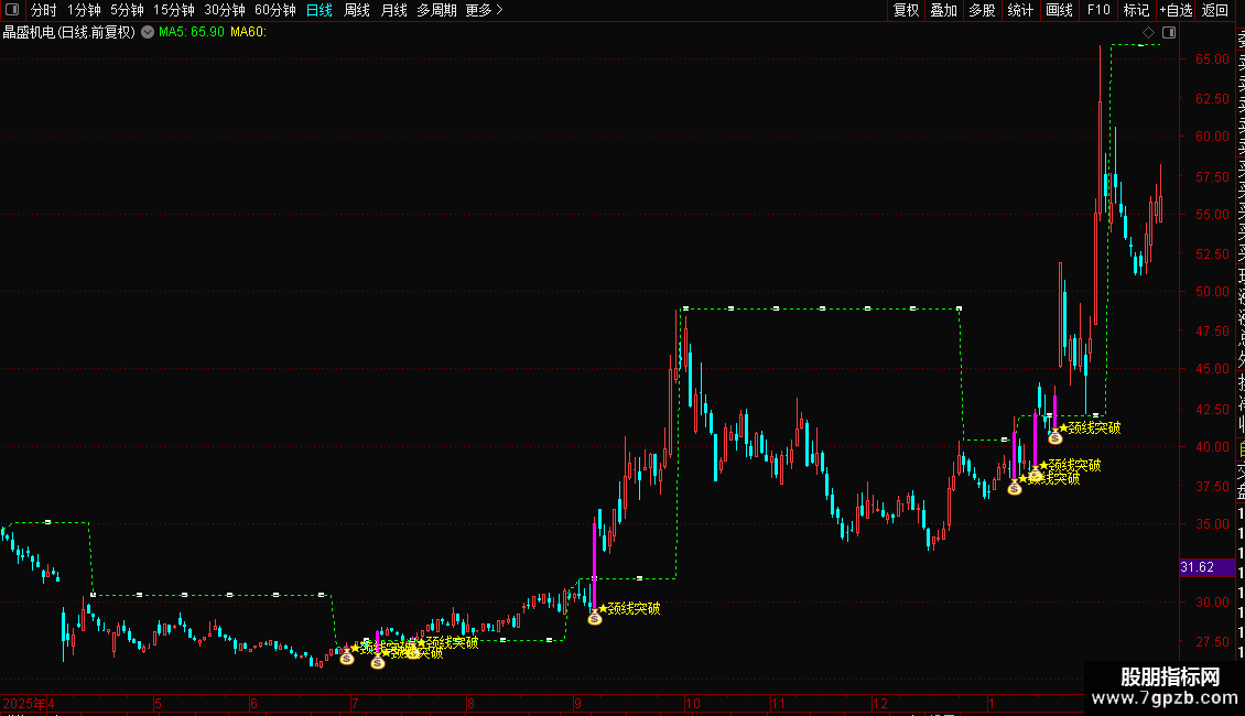 DRAWTEXT(IF(VAR1>VAR14,IF(REF(VAR9< VAR14,1),1,0),0),L,' ★颈线突破'),COLORYELLOW;