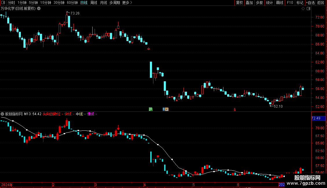 2. 多空趋势线:提供“先知趋势线”(34日均线)以及由快线、中线、慢线构成的一组短期趋势线,用于判断价格的中短期趋势方向。