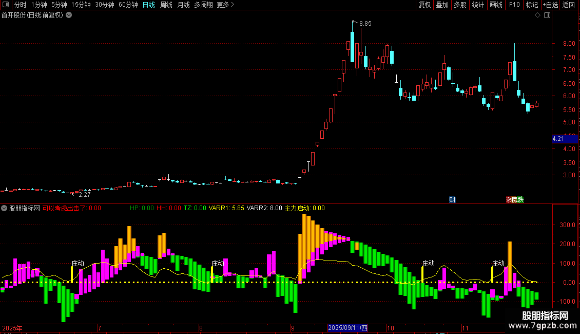 绿色柱(TZ)可能代表基于昨日条件触发的信号或另一种状态。