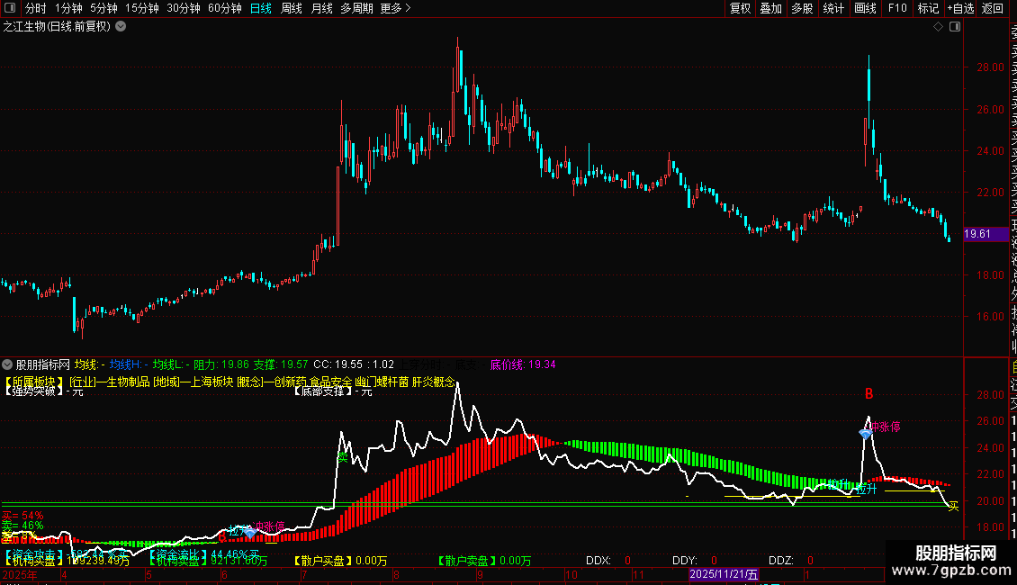 通过7周期与4周期的信号滤波算法,对横盘突破或破位信号做冗余剔除,结合60周期分时均线的趋势强弱界定做二次过滤,形成趋势势能加量能强度加价格结构的三重共振信号输出,锚定主力主动进攻或出逃的临界拐点,提升股票公式指标信号的纯净度。