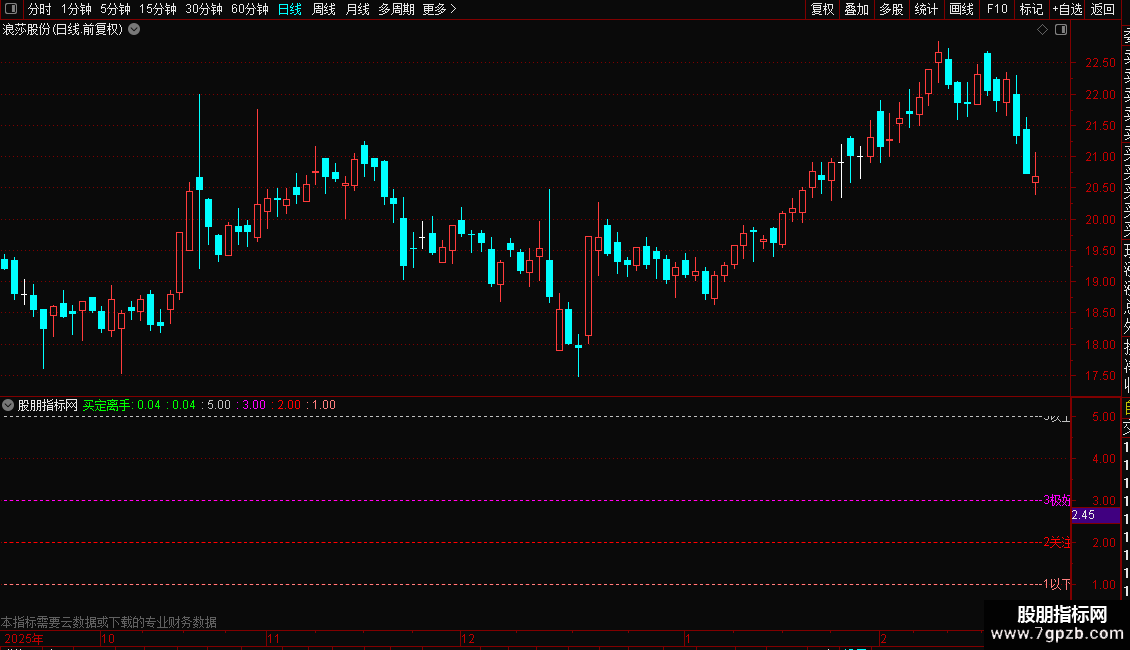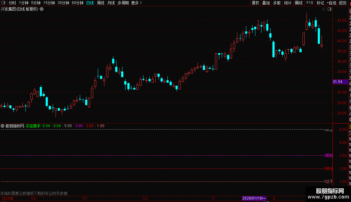 核心计算基于机构持股比例与流通盘的比值,以数值形式在主图区域显示。数值通过不同颜色和位置进行可视化区分:低于1为绿色,表示空仓观望;1-2之间为绿色粗线;2-3之间为红色粗线,提示关注;3以上为紫色粗线,表示极好状态;超过5则用紫色柱状线警示出货风险。