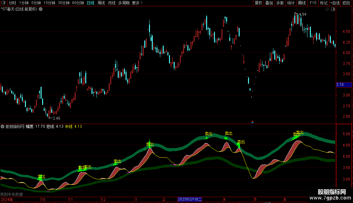 3. 多信号融合:结合通道突破、KDJ指标金叉以及自定义的“机会来临”条件,生成“买入”、“卖出”及“绝杀点”等文字和图标提示信号。
