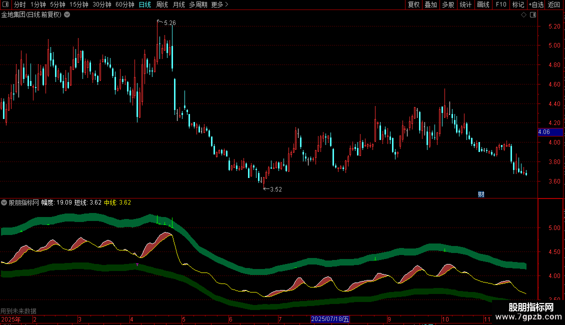 4. 辅助趋势线:额外计算并绘制“短线”与“中线”两条平滑趋势线,并填充色带,用于辅助判断价格趋势和波动区间。