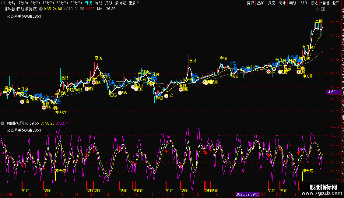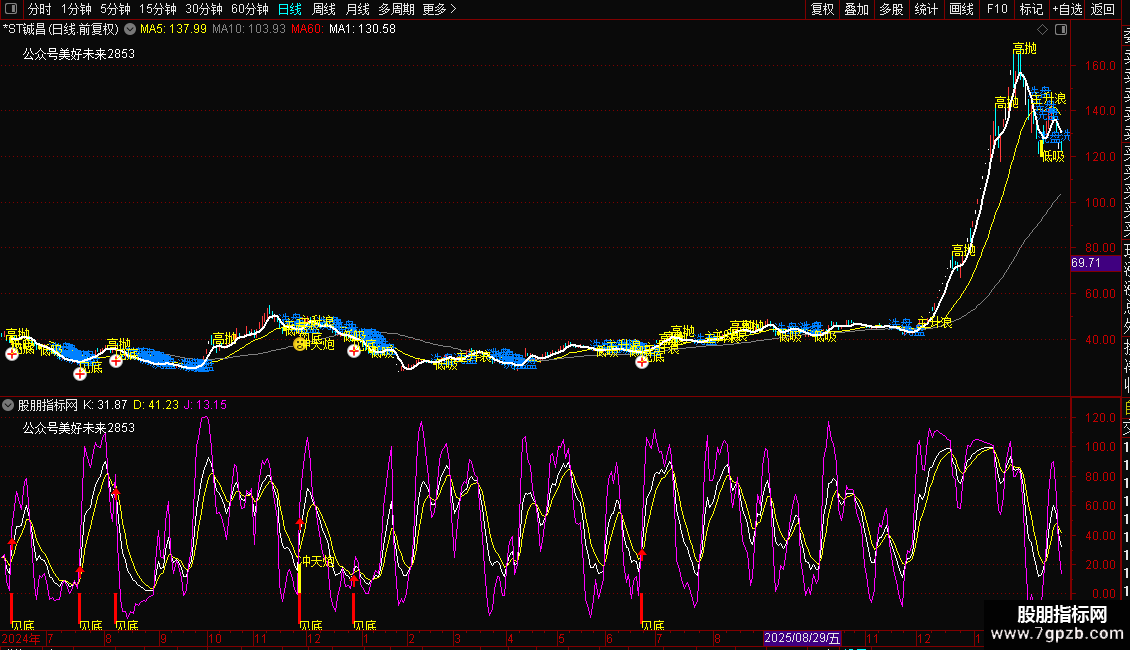 DRAWTEXT(FILTER(买=1,7),LOW-0.1,'低吸'),COLORYELLOW;