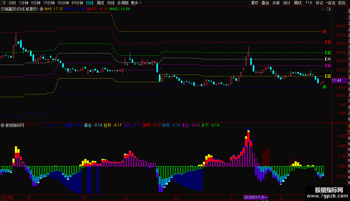 副图(趋势):不同于传统的单一MACD,它叠加了5组不同参数的MACD柱状图(从超长线到短线),通过不同颜色和粗细的柱体,直观展示从大趋势到小波段的多空力量变化。