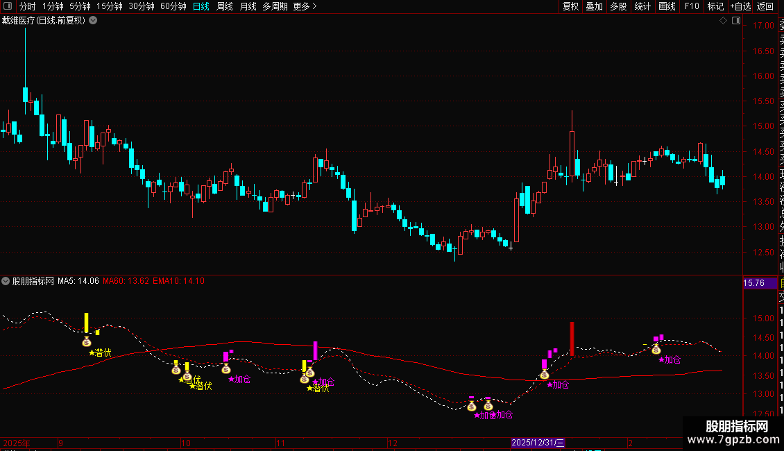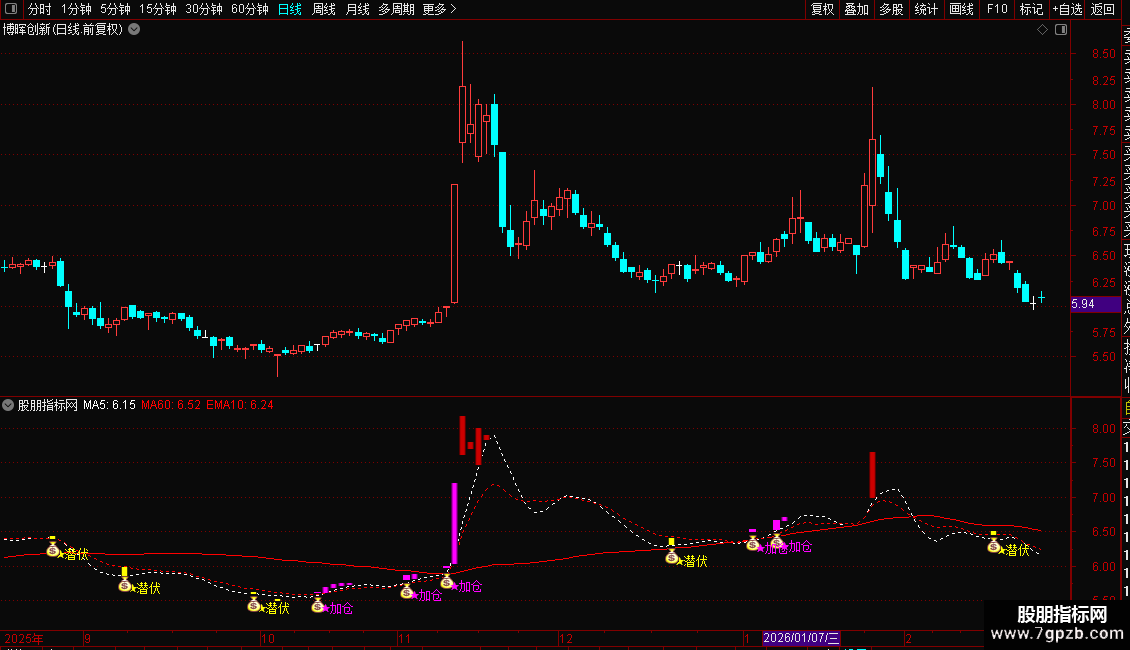 1. 该指标融合均线、强弱指标、金叉信号,主副图联动识别潜伏/加仓点;