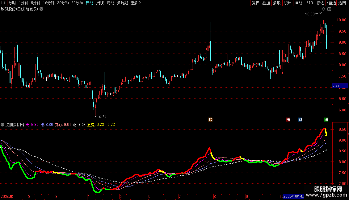 指标通过计算不同周期的移动平均线组合,构建了“天、地、良心、财、五鬼”五条核心均线。其核心逻辑是依据“五鬼”线相对于其他均线的位置关系,以及P1与P3两条复合均线的比较,来动态改变“五鬼”线的颜色和粗细,从而直观显示当前价格在不同层级均线系统中的强弱状态和趋势信号。