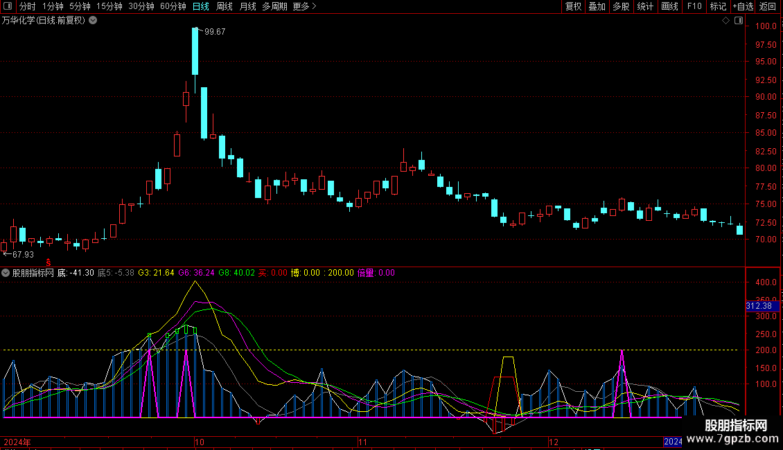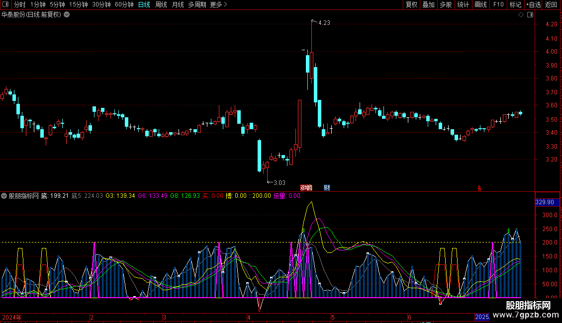 倍量:IF((G6>G8 OR (G8<50 AND G3>G6 AND G6>REF(G6,1))) AND G3>REF(G3,1) AND 底5>REF(底5,1) AND 量,200,0),COLORMAGENTA,LINETHICK2;