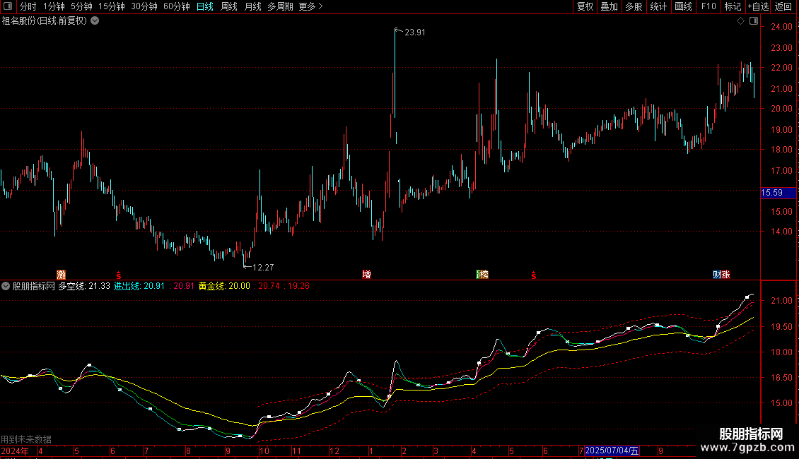 指标包含三条核心线:多空线(白色/绿色)、进出线(紫色/绿色)和黄金线(黄色)。