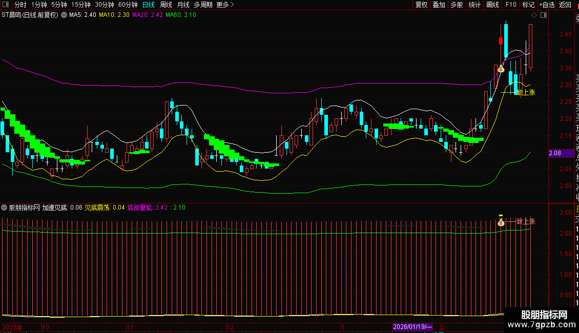 2. 副图指标:关注彩色柱体标注的见底次数,“六次见底”提示底部震荡,“八次九次见底”伴随“底部吸筹/即将拉升”文字,是关键加仓信号;