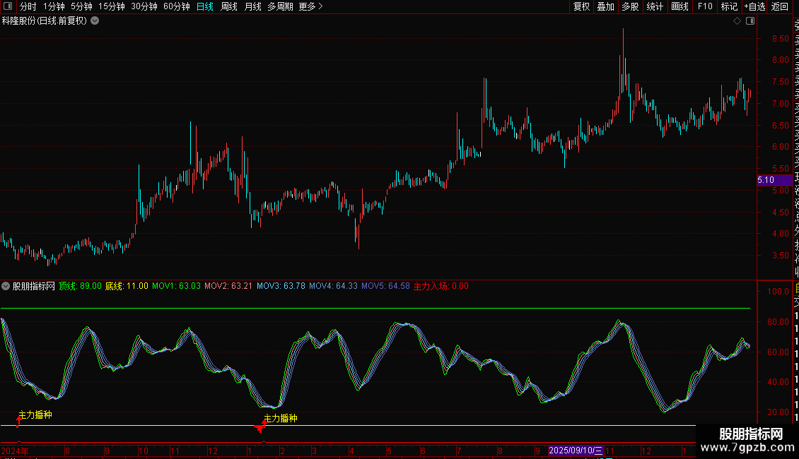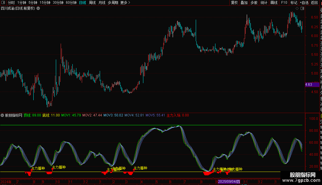 核心买入信号:当出现“主力播种”的图标和文字提示时,表明指标发出主力入场信号,可作为潜在的买入或关注时机。