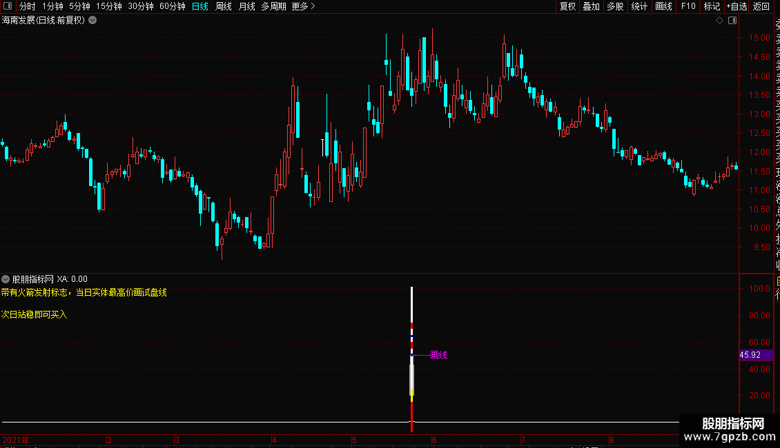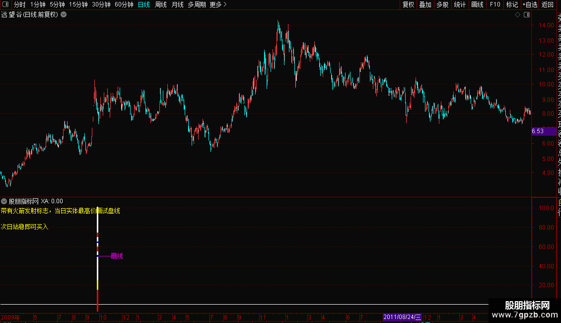 DRAWTEXT_FIX(1,0.00,0.00,0,'带有火箭发射标志,当日实体最高价画试盘线'),COLORYELLOW;