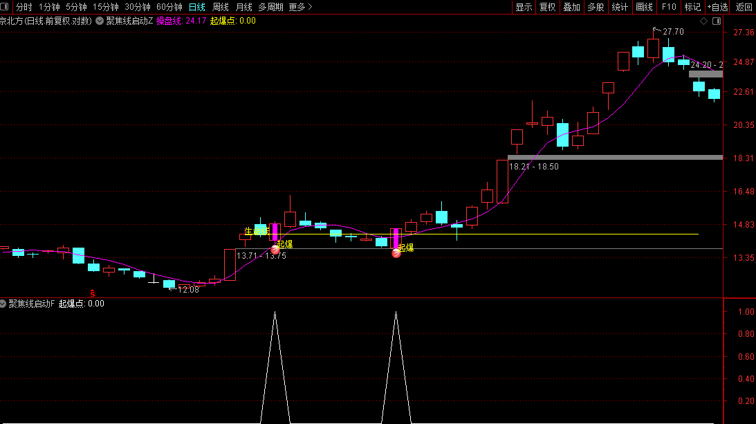 当条件共振时,K线下方会出现“起爆”文字及图标,触发条件如下: