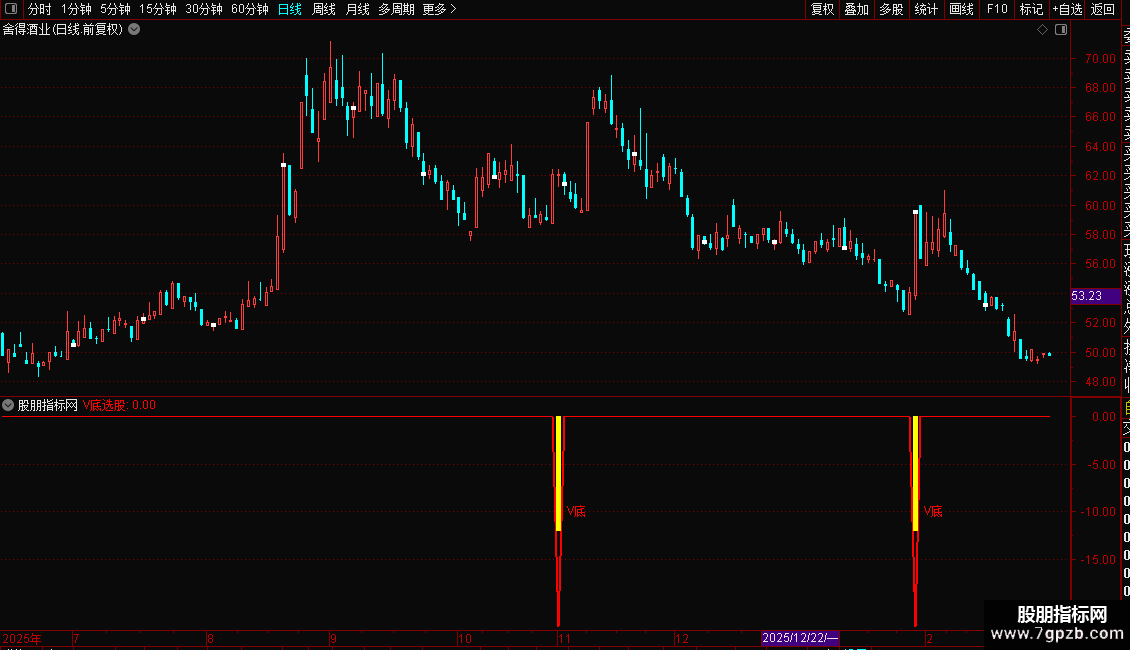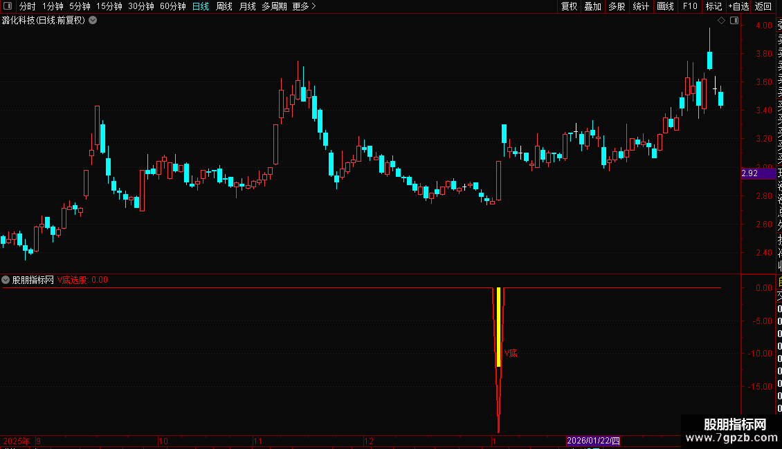 当指标在图表上出现“V底”文字及黄色柱状提示时,意味着可能的V型底部已经形成。这通常预示着下跌趋势结束,新的上涨趋势即将开始。投资者可将其作为中短线的买入参考信号,结合成交量等其他因素综合判断,以把握潜在的反弹或反转行情。