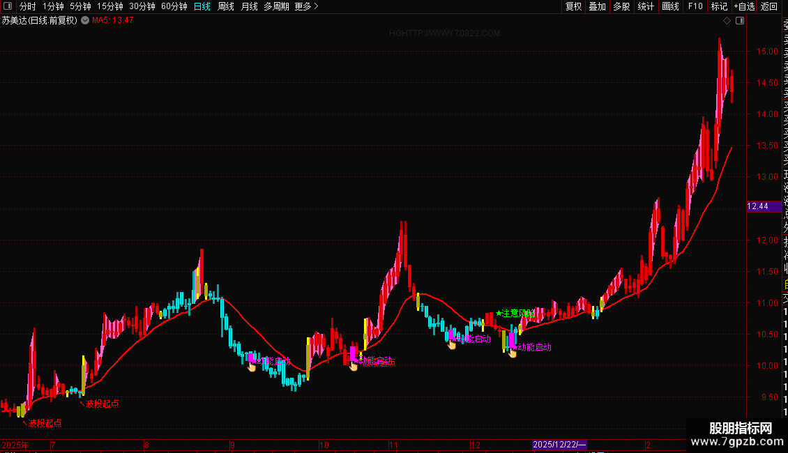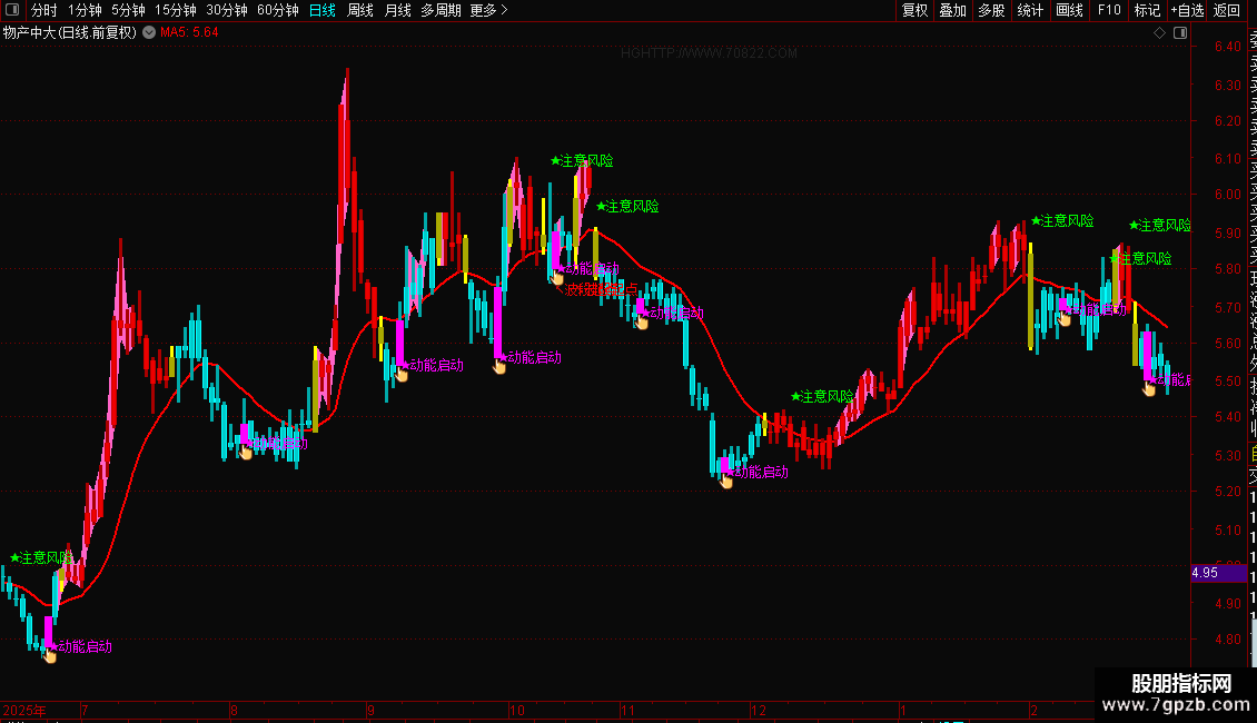 动能启动:当K线底部出现紫色“★动能启动”图标及文字时,代表短期下跌动能衰竭,股价可能迎来爆发,是短线介入的良机。