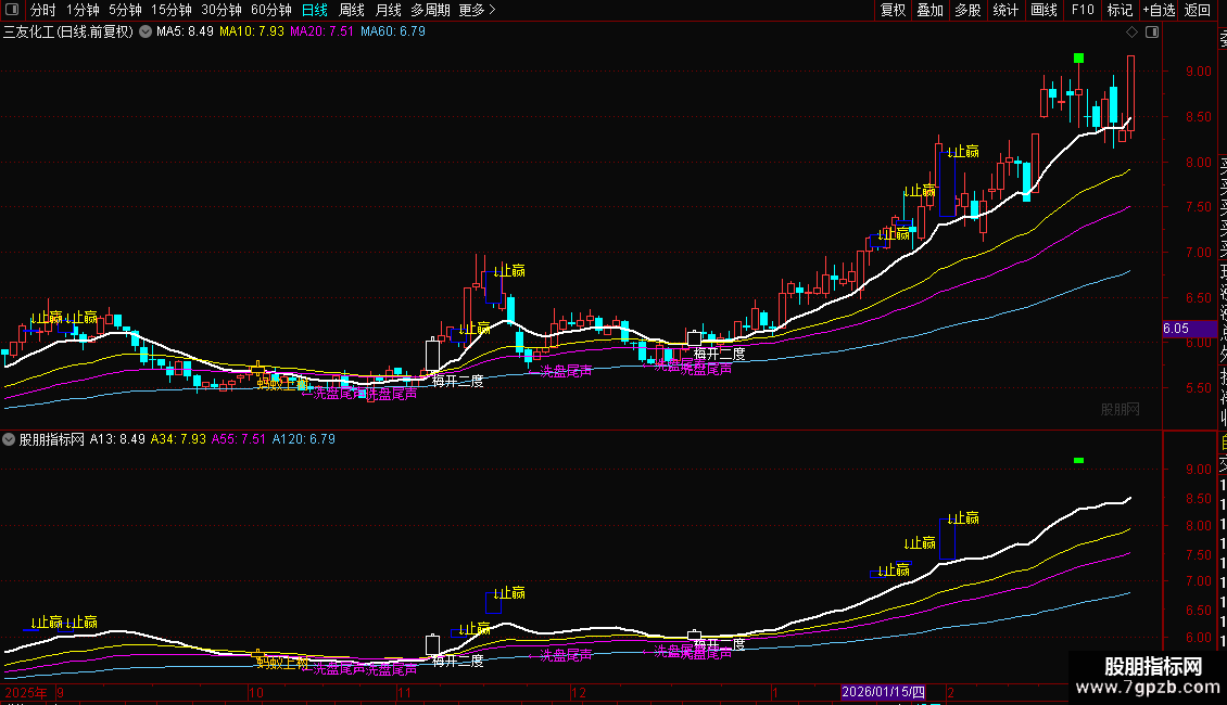 三、红衣侠女:放量上涨突破13EMA,3根K线内完成13EMA与55EMA黄金交叉;粉红文字+粗线画柱,短线动能爆发,配合分时买点快速跟进。