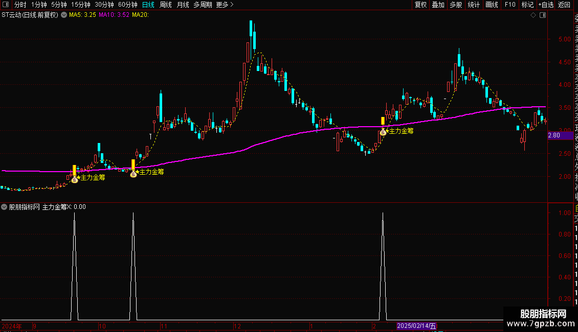 1. 主图公式:导入通达信主图指标后,金筹线(COLORFF00FF)为核心参考位,当个股均线呈多头排列(MA10>MA20>MA60),且股价涨停突破金筹线时,出现的彩色涨停柱和星星提示为买入信号;