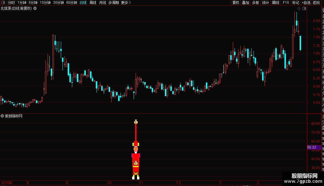 信号出现时,主图K线下方会显示一个由多种彩色柱线组成的特定图案,并在指定位置绘制图标,以进行醒目的可视化提示。