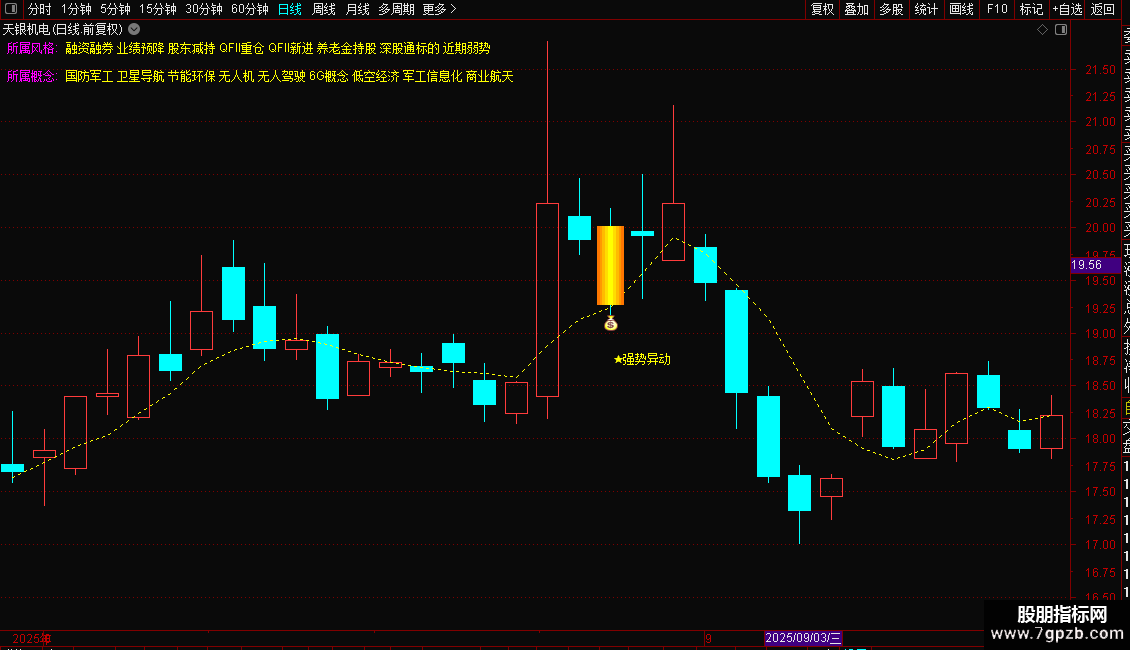 4. 强势异动信号:综合价格、成交量、均线位置与形态,寻找符合“强势异动”条件的时点。当条件满足时,会在K线下方标注信号文字,并用渐变色柱状图标亮对应的K线,同时附加图标提示。