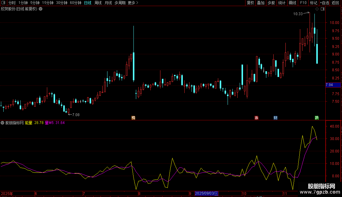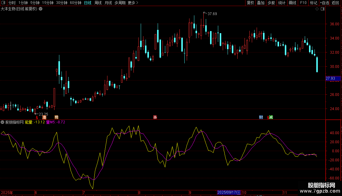 主指标“能量”基于OBV(累积成交量)计算,反映资金流入流出强度。