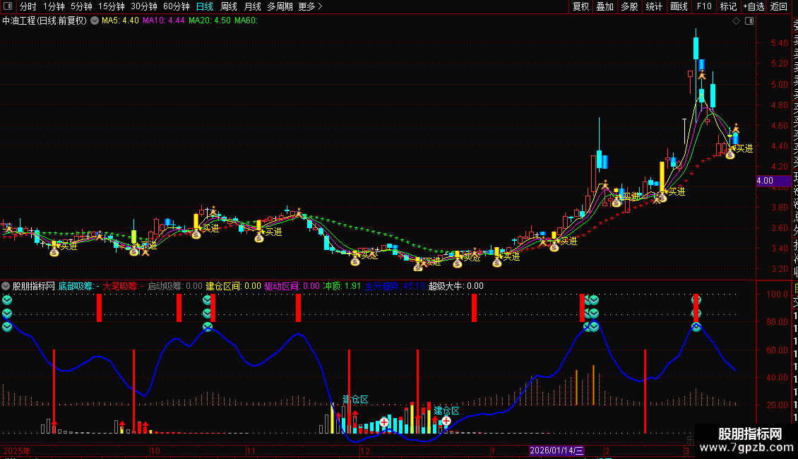 2. 当幅图出现红色量能柱,同时主图发出买进信号时,两者共振代表股票行情已经见底,这是一个可靠的底部买入信号,投资者可重点关注这一股票底部买入技巧。