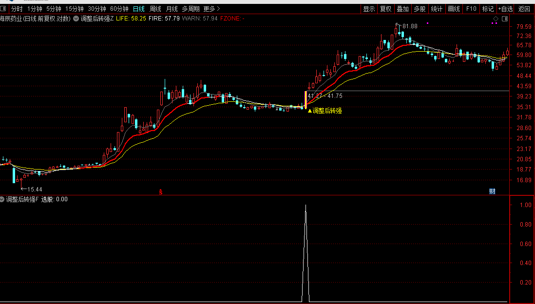 买入信号:当K线图上出现粉紫色的“▲调整后转强”标记时,视为一个交易信号。该标记表明,股价在经历充分调整后,可能即将开启新一轮上涨行情,投资者可将其作为择机买入的参考依据。