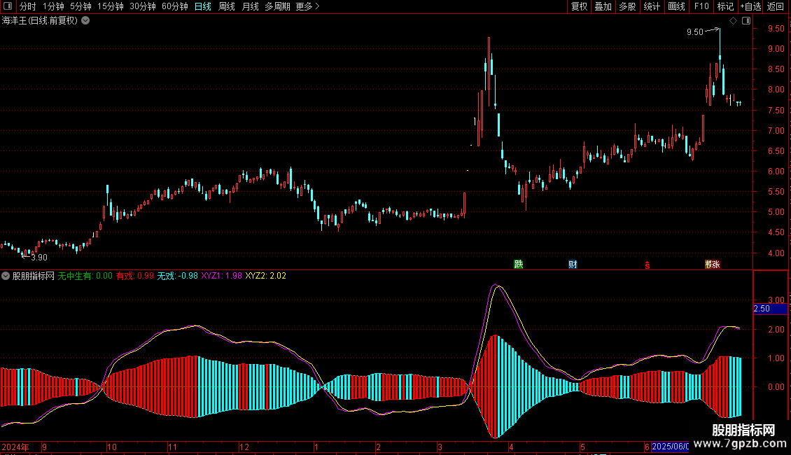 指标通过计算两条不同周期EMA的差值比率,构建“有戏”与“无戏”两条主线,反映短期趋势强度。其差值XYZ1与均线XYZ2的对比,用于判断多空状态,并通过柱状图直观显示。整体用于捕捉价格动量的变化与转折点。