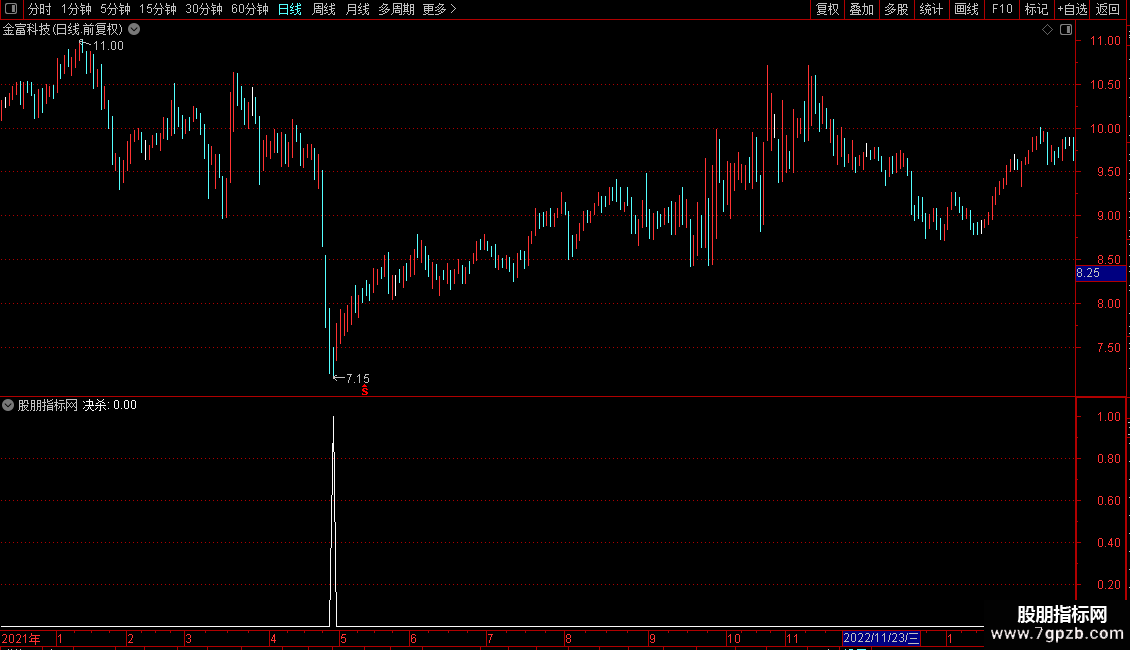 当以上三个条件同时满足时,指标输出“决杀”信号。该信号旨在捕捉股价在连续下跌后,开盘跳空低开但日内有所回升,且整体仍处于多条均线压制下的特定技术形态。