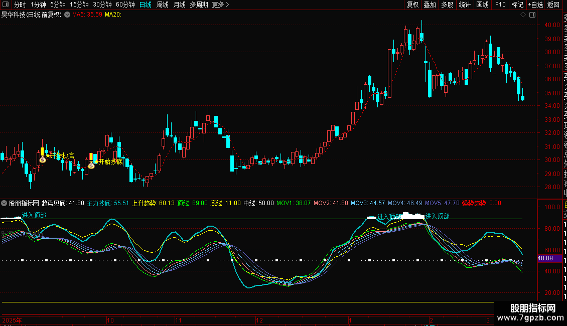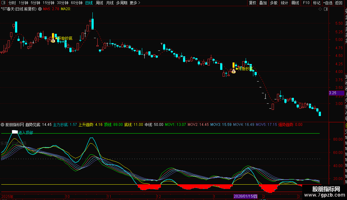 1. **主图指标**:以5日均线为基础,结合EMA均线差值和价格震荡因子(DD),满足多条件共振时,会在K线标注黄色柱体、“★开始抄底”文字及买入图标,直观提示抄底信号。