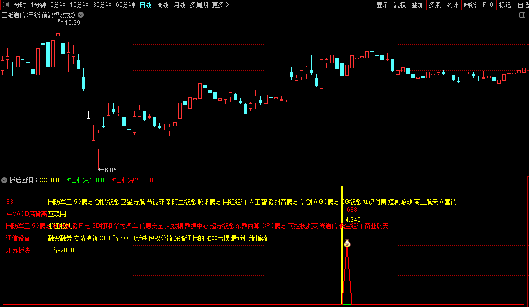 2.指标用法:今买明卖操作。尾盘买入,第二天冲高出局,不拿到收盘,这样的话,相对安全。使用【板后回调S】升级版可在收盘前5-10分钟左右使用选股器选股,选出当天出现的信号,然后打开相应个股查看【板后回调S】升级版指标的副图,若果您也看好该股,临近收盘前3-5分钟副图信号不消失可介入。第二天盘中冲高就出,不必等到收盘。
