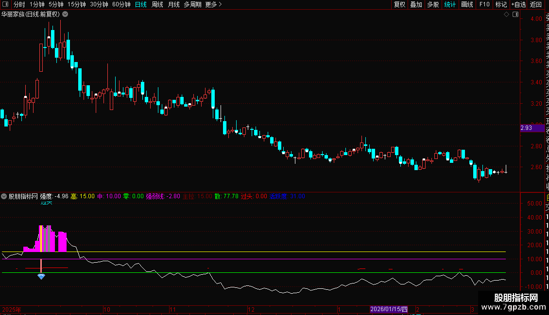 STICKLINE(强弱线=4.2 AND 强度>=15,15,强度,4,0),COLORFF00FF;