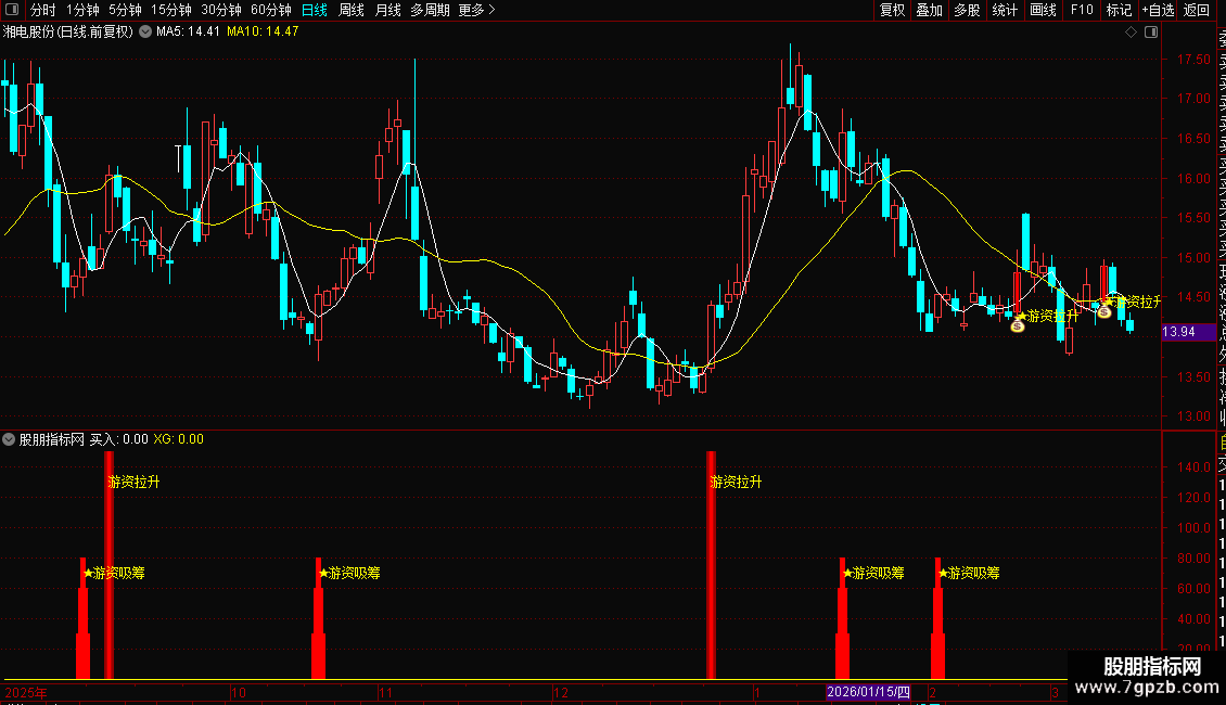 4. 游资低位吸筹布局确认后,主图幅图出现游资拉升共振信号,代表进入连板加速行情