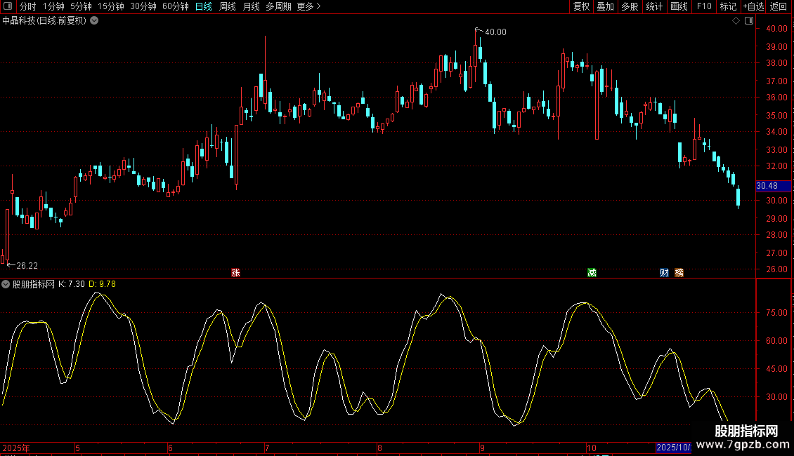 指标基于随机震荡指标(KDJ)原理构建,通过计算K值与D值来识别趋势与买卖点。