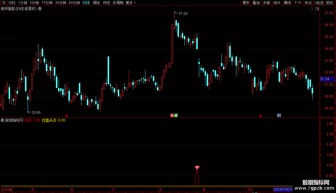 2. 控盘买点:在基础买点出现后,进一步要求资金呈现“有庄控盘”的流入状态,并且股价上穿短期趋势线。这是更强烈的买入信号,会在副图以特殊的蓝色柱状和黄色文字标注。